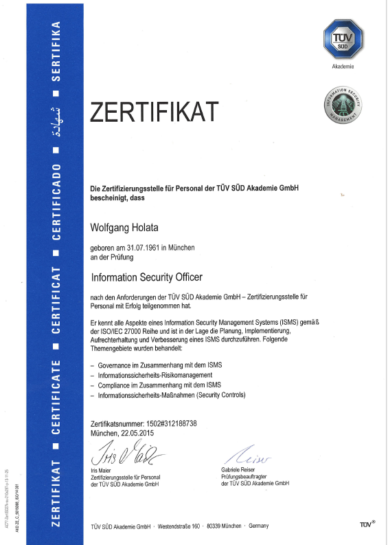 2015 habe ich die Schulung zum Information Security Officer beim TÜV Süd erfolgreich abgeschlossen.